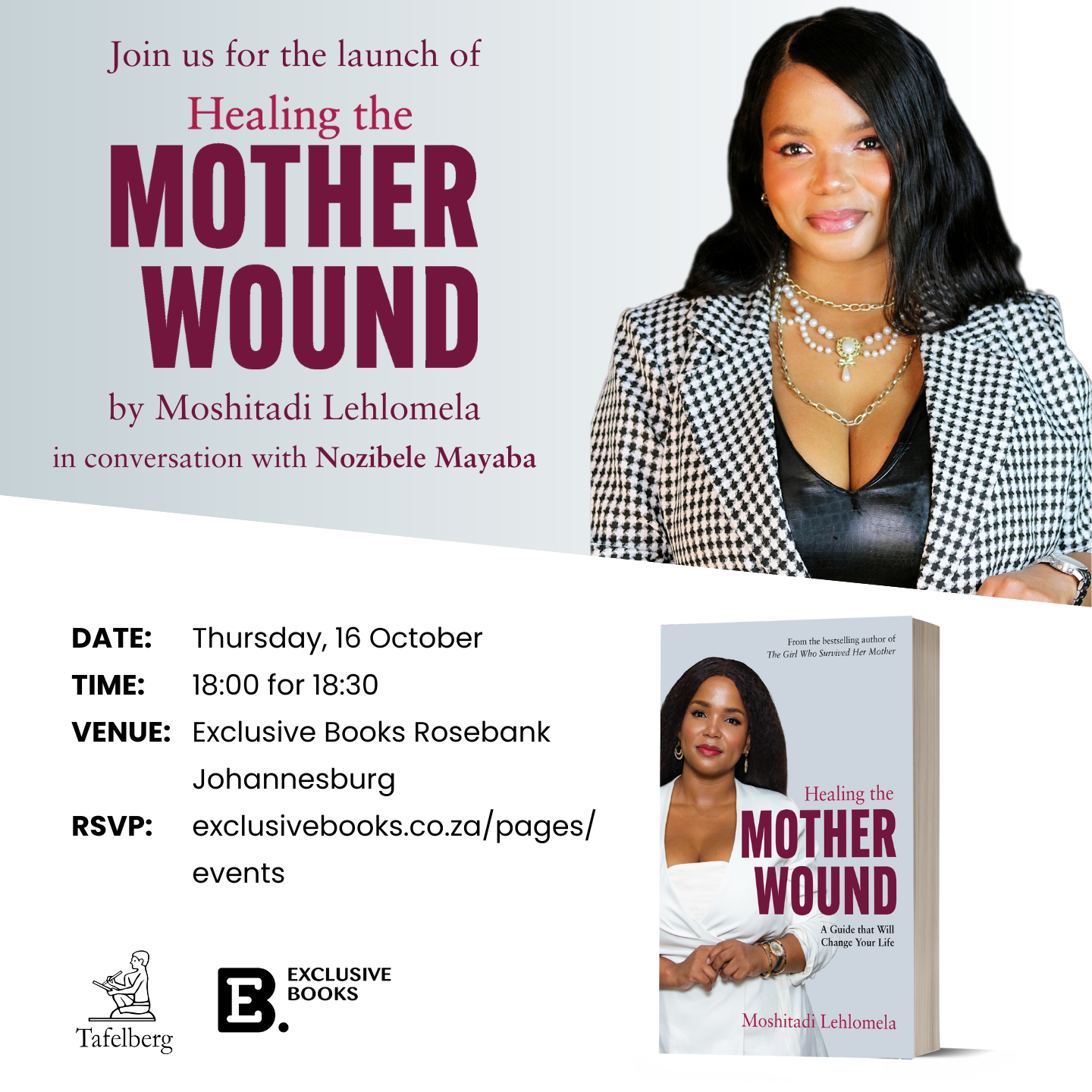 Tafelberg & Exclusive Books Healing the MOTHER WOUND - A Guide that Will Change Your Life Author: Moshitadi Lehlomela (From the bestselling author of The Girl Who Survived Her Mother) Conversation: Moshitadi Lehlomela with Nozibele Mayaba Location: Exclusive Books Rosebank, Johannesburg Date: Thursday, 16 October Time: 18:00 for 18:30 RSVP: exclusivebooks.co.za/pages/events